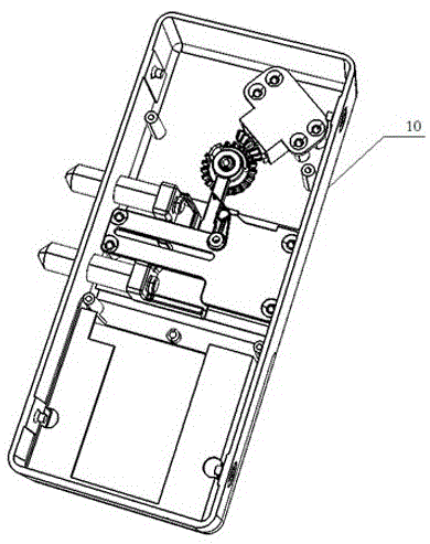 在圖中:10.金屬底座;11.定位柱;12.電機座;13.導(dǎo)軌;14.通孔;20.電機;21.電機壓板;30.電機齒輪;40.旋鈕齒輪;41.擋片;50.門內(nèi)旋鈕;51.主軸;60.撥桿;70.滑板;71.插銷;72.u型槽;80.滑板壓板;81.第二通孔;90.助力彈簧。